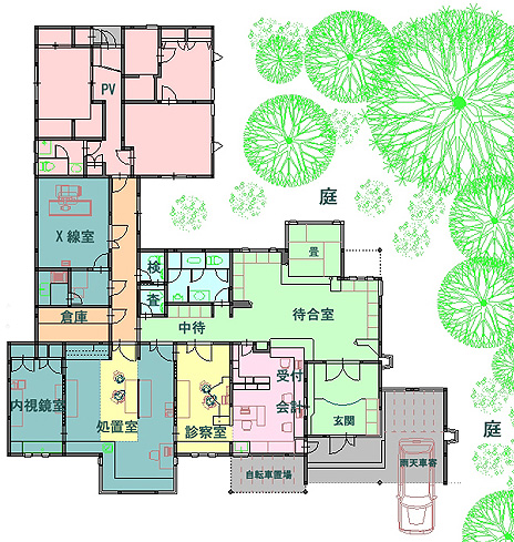 駐車場は駐車しやすく、夏の日差しから守られていたいもの、待合室は已む無く待ち時間を過ごして頂く空間、受療者にリラックスしてもらえる居住性が必要と考えました。検査、処置スペースは機能、安全、清潔が大切と思います。 |